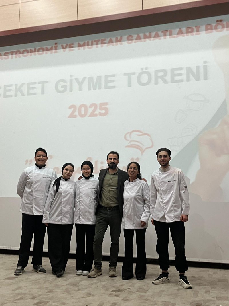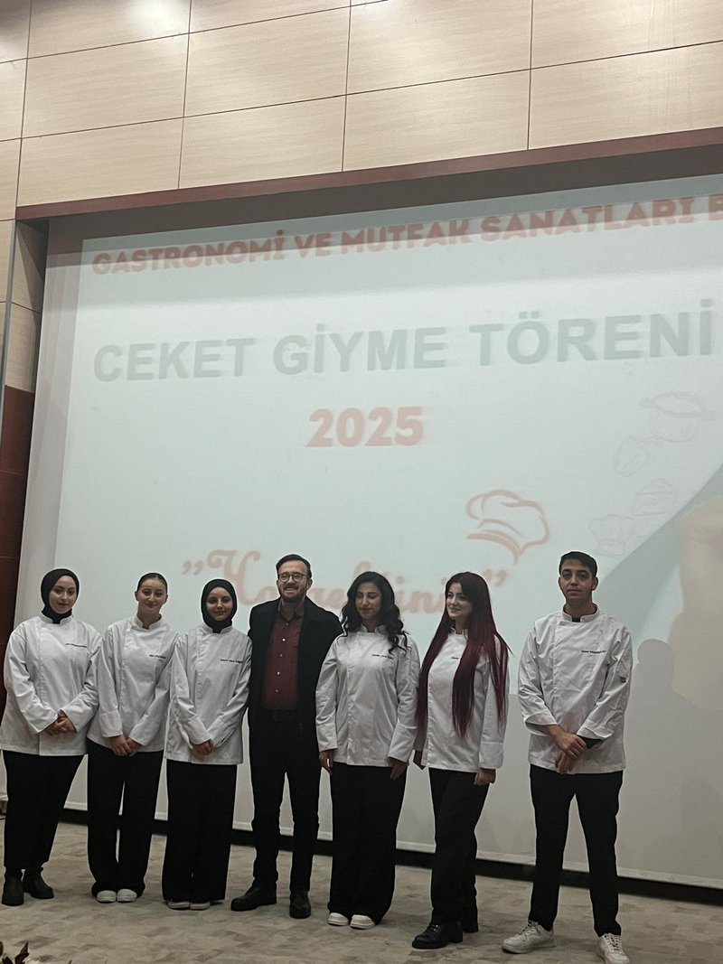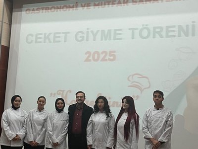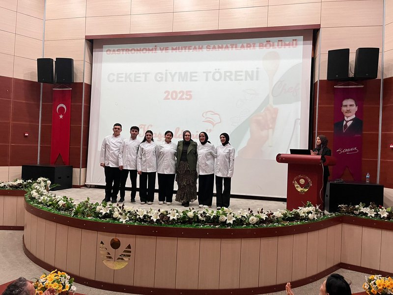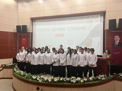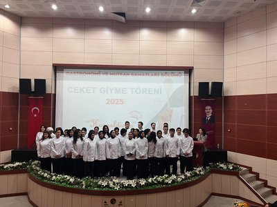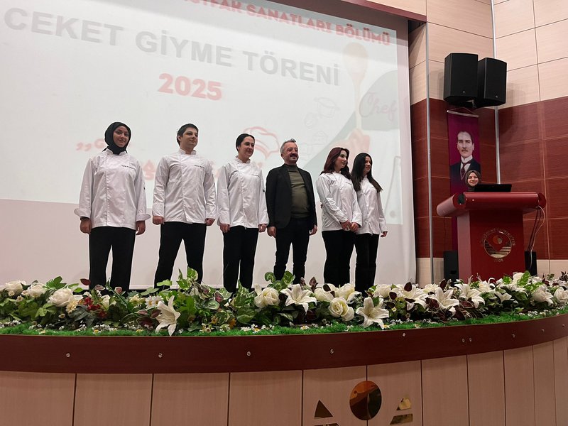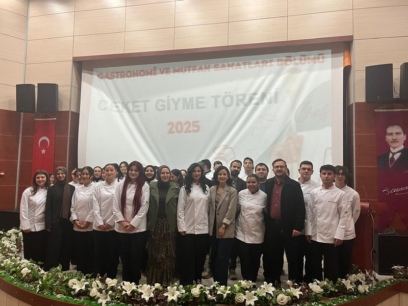 Following the speeches, the jacket-wearing ceremony commenced. Prof. Dr. Sevim Beyza Öztürk Sarıkaya, Assoc. Prof. Dr. Savaş Evren, Assoc. Prof. Dr. İsmail Çalık, Assoc. Prof. Dr. Fazıl Kaya, Dr. Lecturer Seda Kamber Taş, Dr. Lecturer Murat Ödemiş, Lecturer Dr. Sedat Taş, and Research Assistant Aleyna Gün dressed the students in chef's aprons. Dr. Seda Kamber Taş administered the chef's oath to the students wearing their jackets. After the oath ceremony, a group photo was taken, and the ceremony was completed. Following the ceremony, the students went to the training kitchen to perform their first kitchen application wearing their chef jackets.