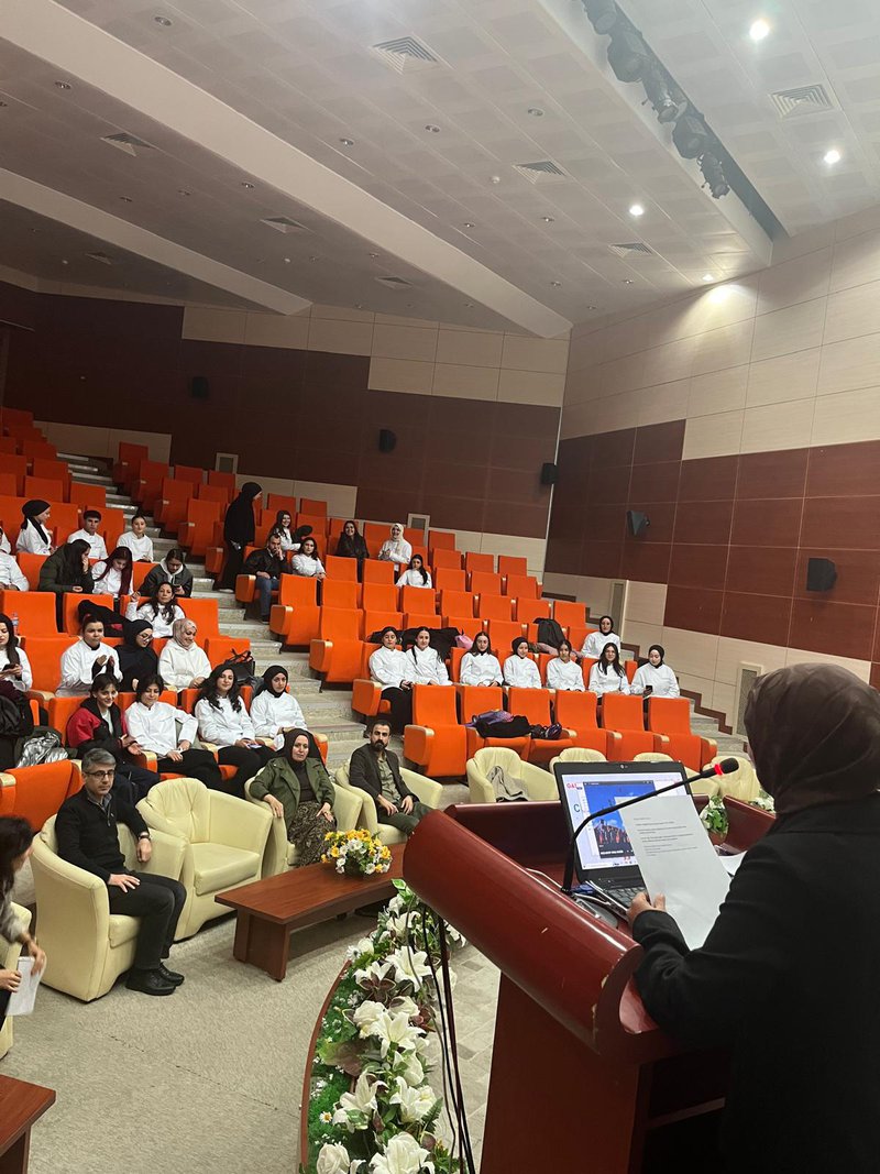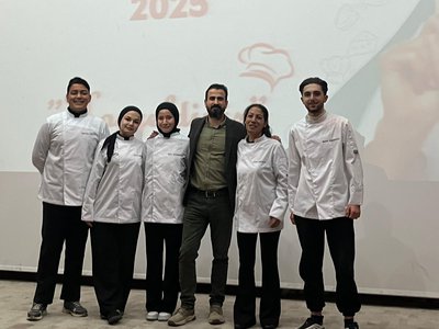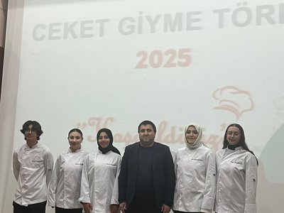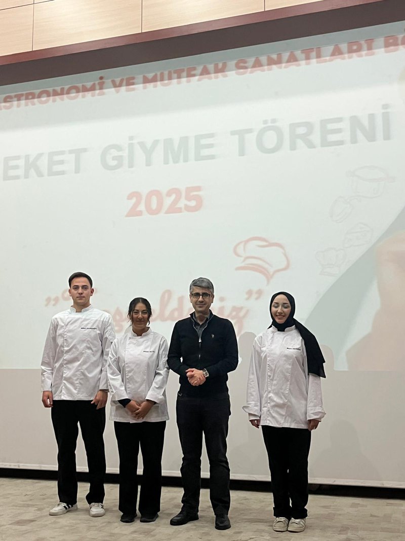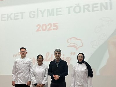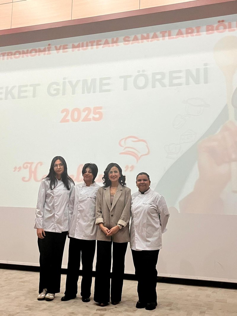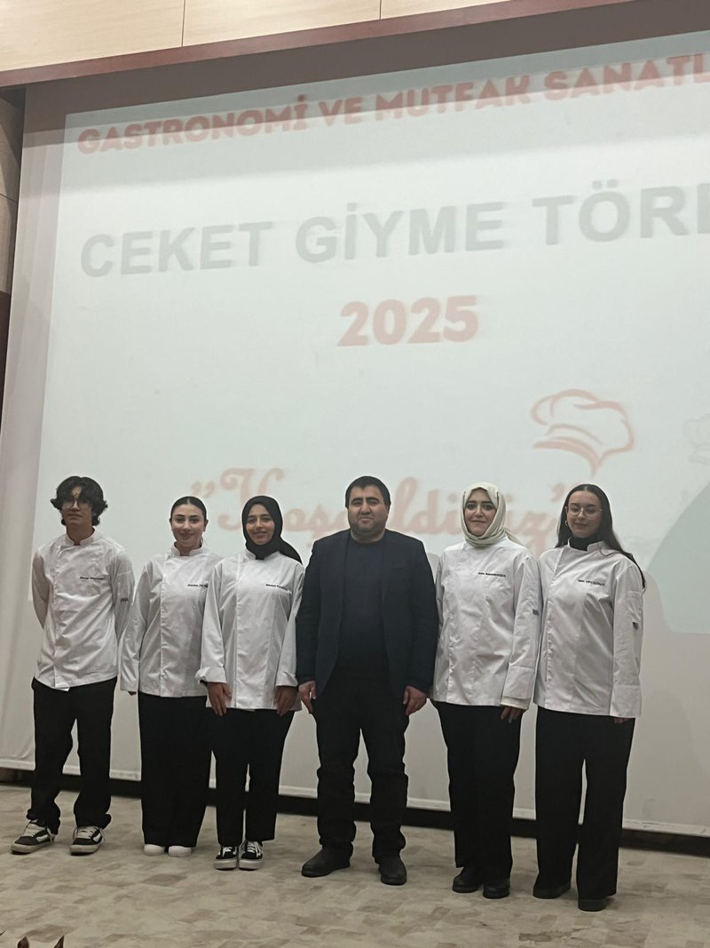 Following the speeches, the jacket-wearing ceremony commenced. Prof. Dr. Sevim Beyza Öztürk Sarıkaya, Assoc. Prof. Dr. Savaş Evren, Assoc. Prof. Dr. İsmail Çalık, Assoc. Prof. Dr. Fazıl Kaya, Dr. Lecturer Seda Kamber Taş, Dr. Lecturer Murat Ödemiş, Lecturer Dr. Sedat Taş, and Research Assistant Aleyna Gün dressed the students in chef's aprons. Dr. Seda Kamber Taş administered the chef's oath to the students wearing their jackets. After the oath ceremony, a group photo was taken, and the ceremony was completed. Following the ceremony, the students went to the training kitchen to perform their first kitchen application wearing their chef jackets.